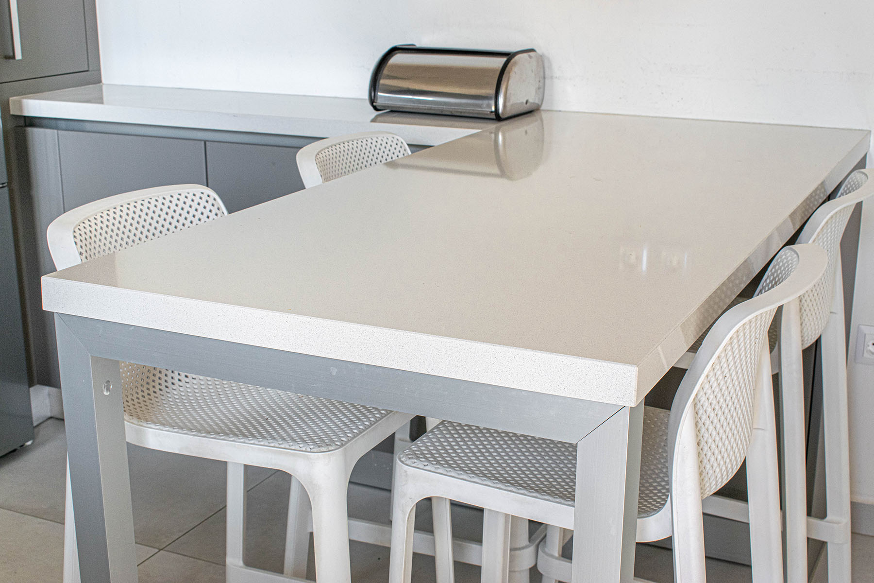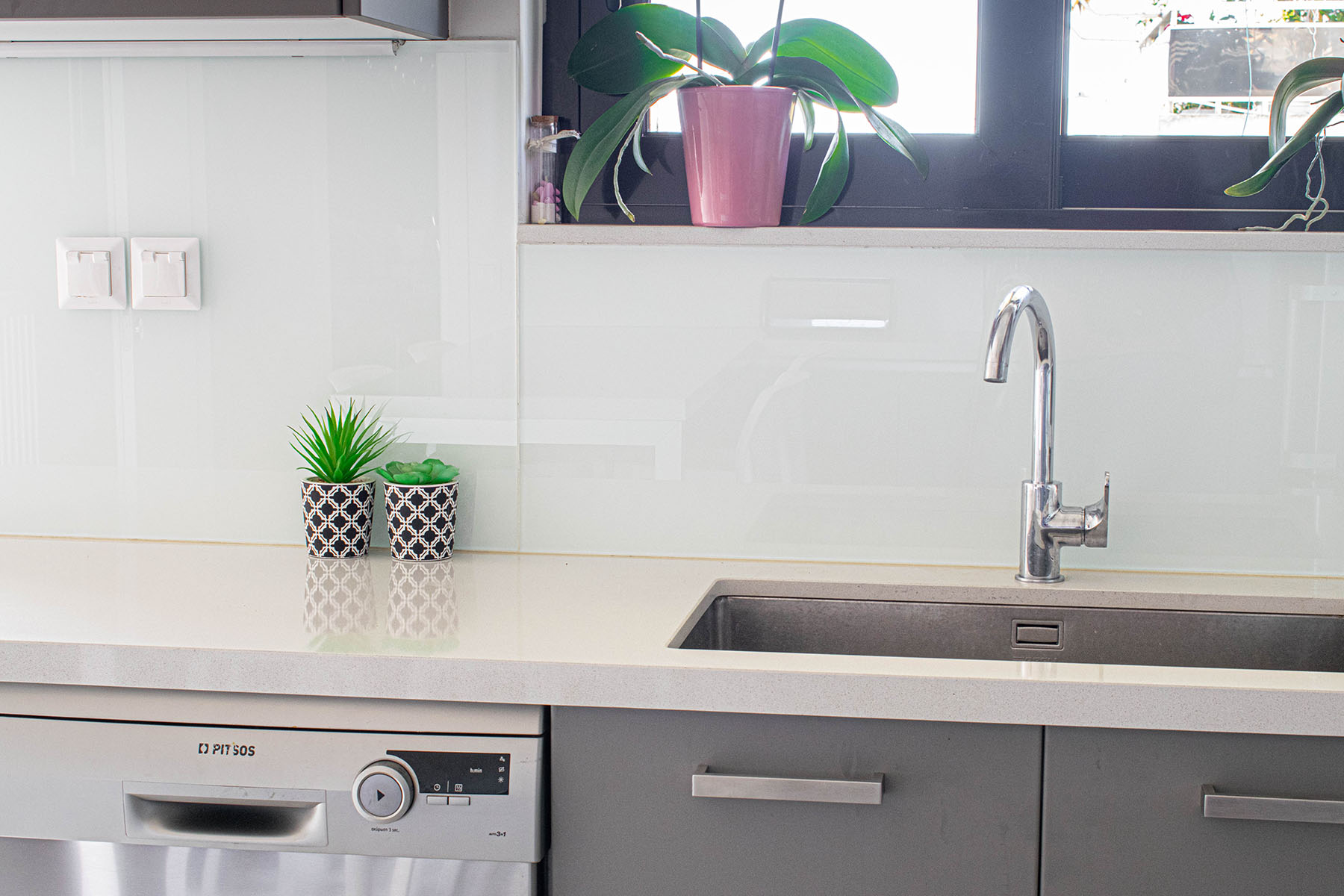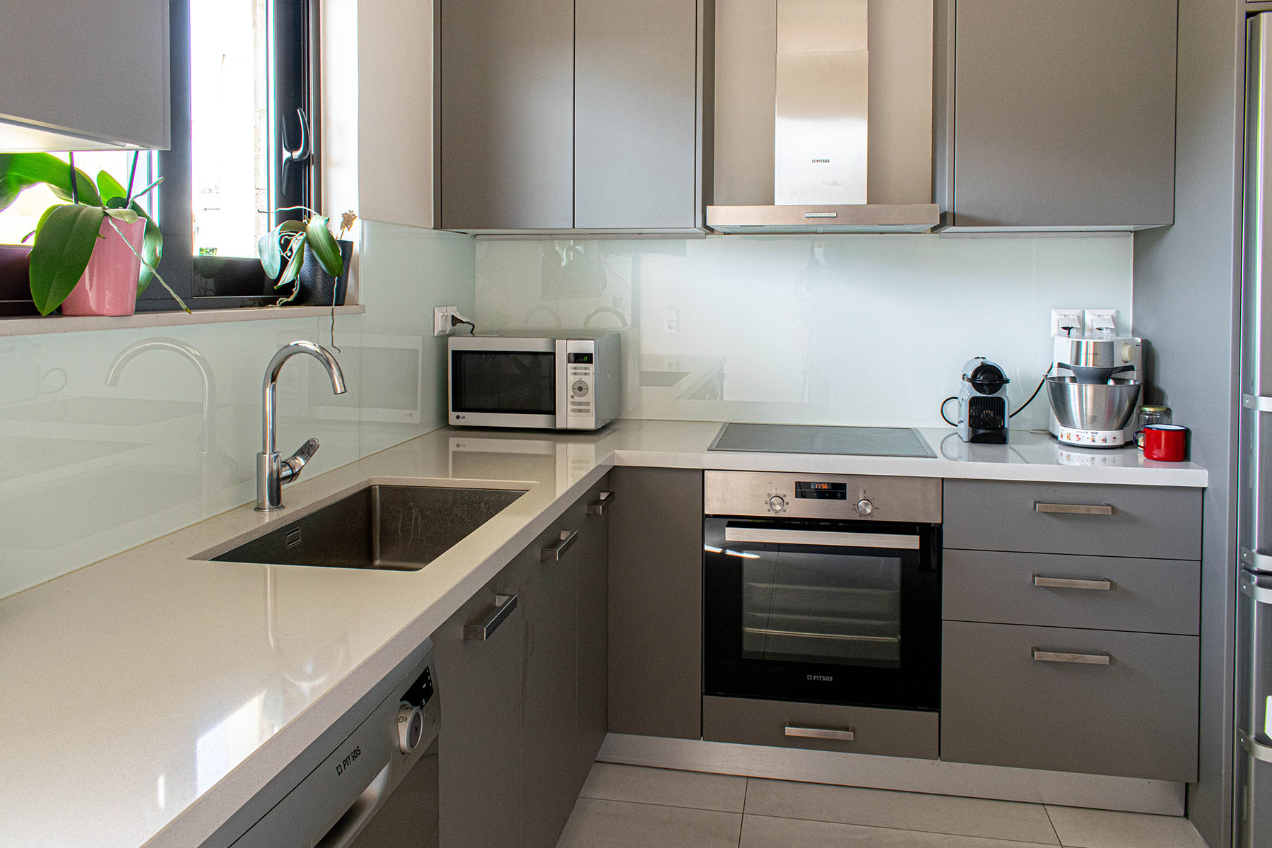 'Επιπλα κουζίνας σε μοντέρνο στυλ. Κουζίνα σε γκρι απόχρωση. Πορτάκι HPL με πάγκο από χαλαζία και πλάτη με τζάμι securit λευκό. Ο συνδυασμός λευκού και ανοιχτού γκρι σε μοντέρνο ύφος αναδεικνύεται ως μία από τις πιο κομψές και ευέλικτες επιλογές στην κατασκευή κουζίνας, προσφέροντας φωτεινότητα, ηρεμία και στυλ χωρίς υπερβολές. Η κατασκευή της κουζίνας έγινε από την εταιρεία Μασίφ Δρυς.