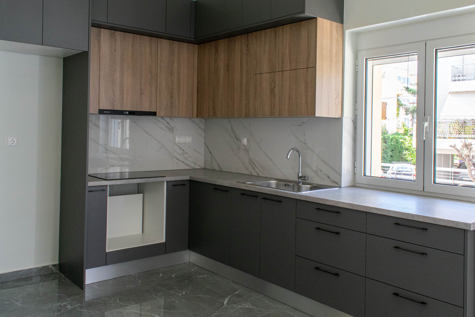 Ο χρωματικός συνδυασμός του καφέ και του γκρι έρχεται να αποδείξει πως η κομψότητα μπορεί να συνυπάρχει με τη θαλπωρή. Η κατασκευή της κουζίνας έγινε από την εταιρεία Newhouse Deligiannis Giorgos.