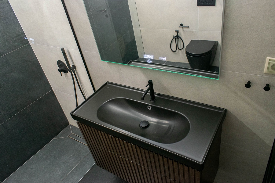 Το μπάνιο, από ένας απλός βοηθητικός χώρος, εξελίσσεται πλέον σε έναν προσωπικό χώρο χαλάρωσης και ευεξίας. Στη σύγχρονη αρχιτεκτονική και διακόσμηση εσωτερικών χώρων, η επιλογή των υλικών και των χρωμάτων παίζει καθοριστικό ρόλο. Ο συνδυασμός του μαύρου με το φυσικό ξύλο είναι ένας από τους πιο επιτυχημένους τρόπους να αποδώσουμε πολυτέλεια, στυλ και ζεστασιά σε ένα μπάνιο. Η ανακαίνιση μπάνιου έγινε από την εταιρεία Newhouse Deligiannis Giorgos.
