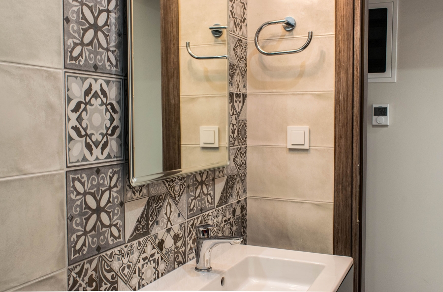 Ανακαίνιση μπάνιου από την εταιρεία Ψύχας Τεχνική. Το έπιπλο μπάνιου, το οποίο κατασκευάζεται από την εταιρεία Ψύχας Τεχνική, είναι από μελαμίνη, με συρτάρια με φρένο και νιπτήρα από πορσελάνη διαστάσεων 0,90x0,45cm. Επιλέχθηκε οροφή γυψοσανίδας.
