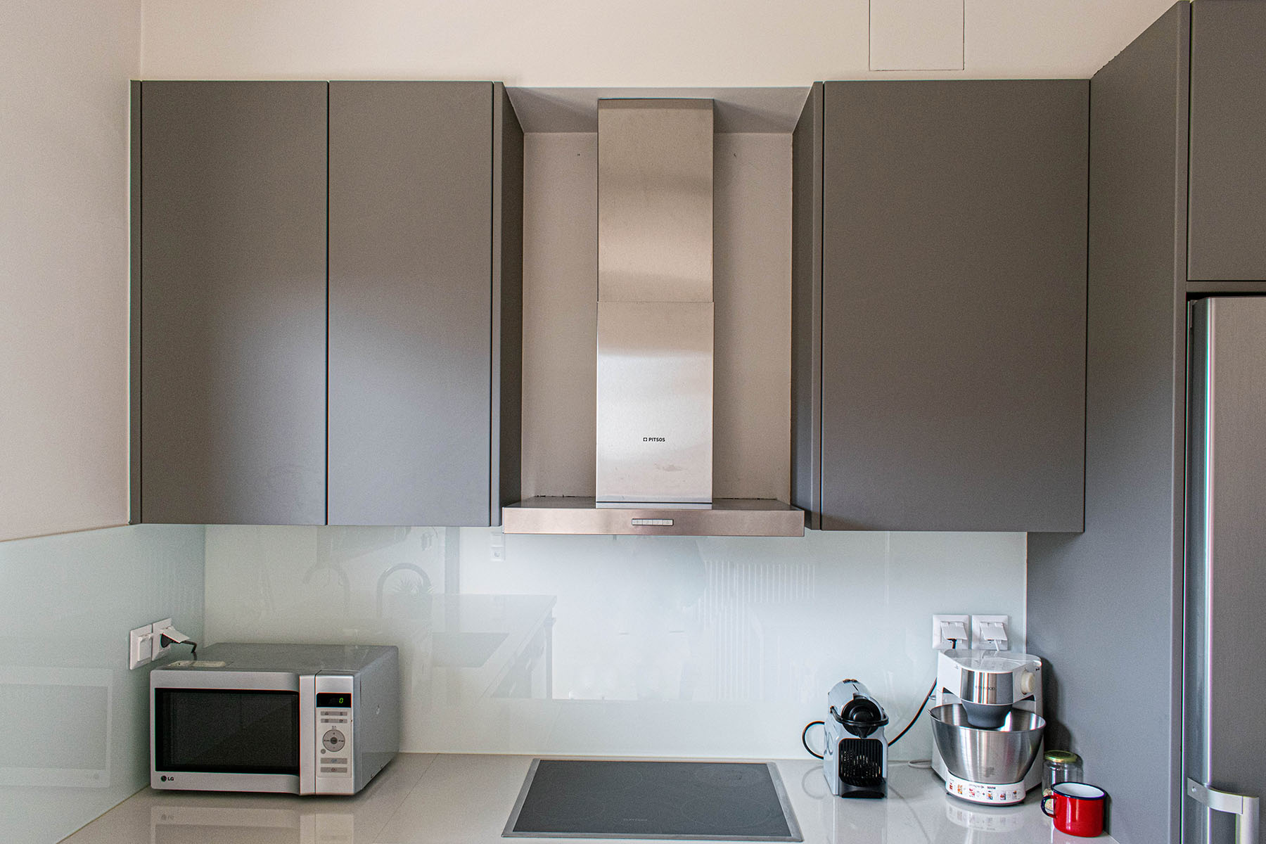 'Επιπλα κουζίνας σε μοντέρνο στυλ. Κουζίνα σε γκρι απόχρωση. Πορτάκι HPL με πάγκο από χαλαζία και πλάτη με τζάμι securit λευκό. Ο συνδυασμός λευκού και ανοιχτού γκρι σε μοντέρνο ύφος αναδεικνύεται ως μία από τις πιο κομψές και ευέλικτες επιλογές στην κατασκευή κουζίνας, προσφέροντας φωτεινότητα, ηρεμία και στυλ χωρίς υπερβολές. Η κατασκευή της κουζίνας έγινε από την εταιρεία Μασίφ Δρυς.