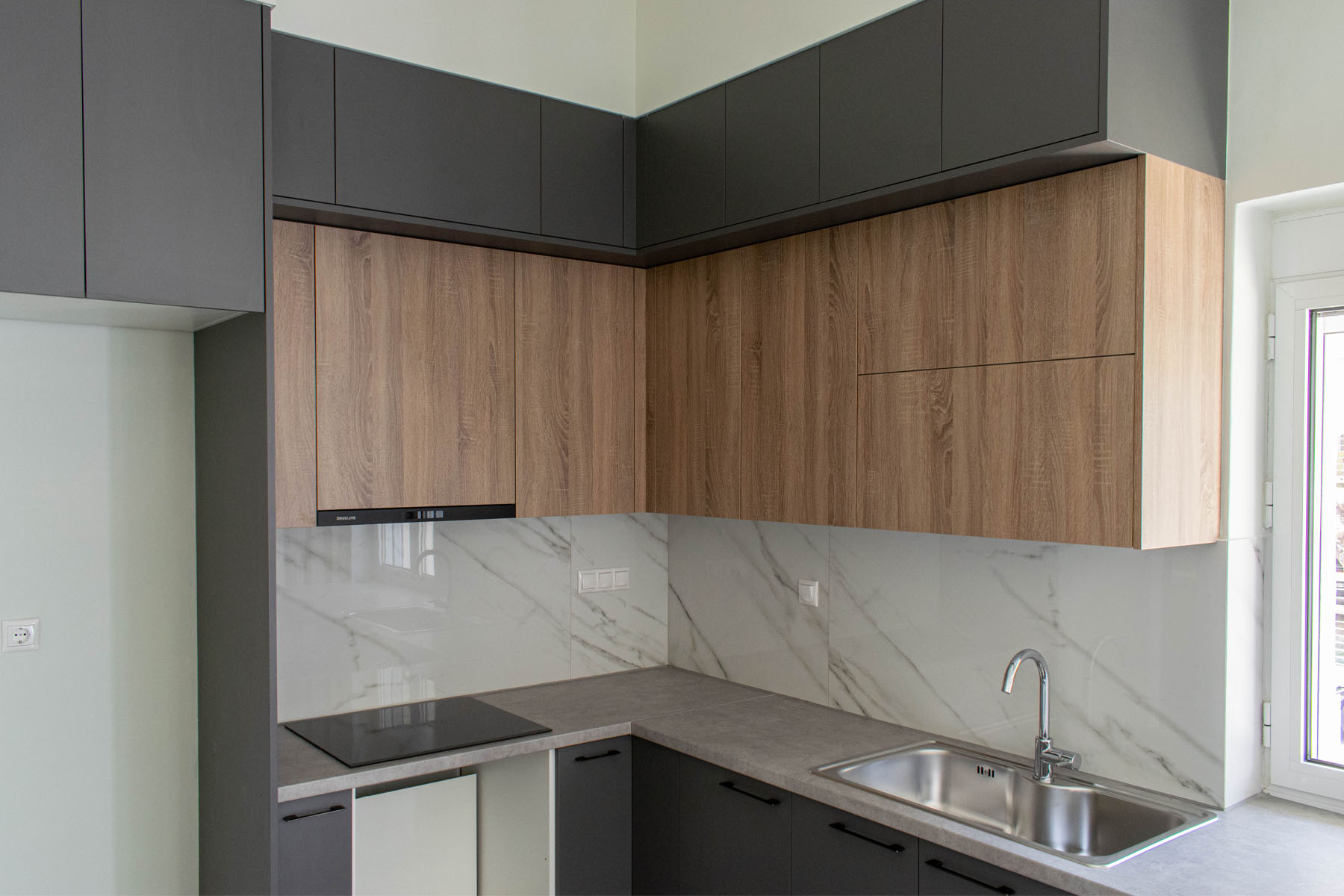 Ο χρωματικός συνδυασμός του καφέ και του γκρι έρχεται να αποδείξει πως η κομψότητα μπορεί να συνυπάρχει με τη θαλπωρή. Η κατασκευή της κουζίνας έγινε από την εταιρεία Newhouse Deligiannis Giorgos.