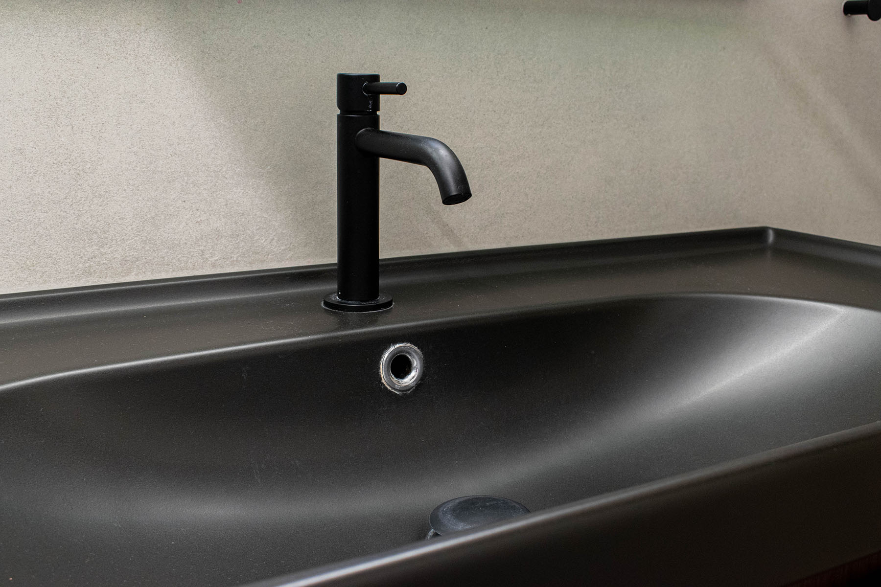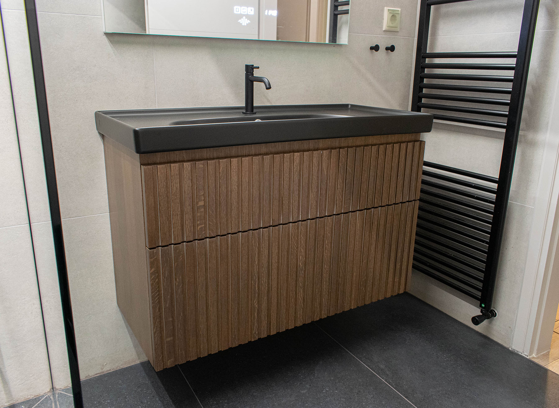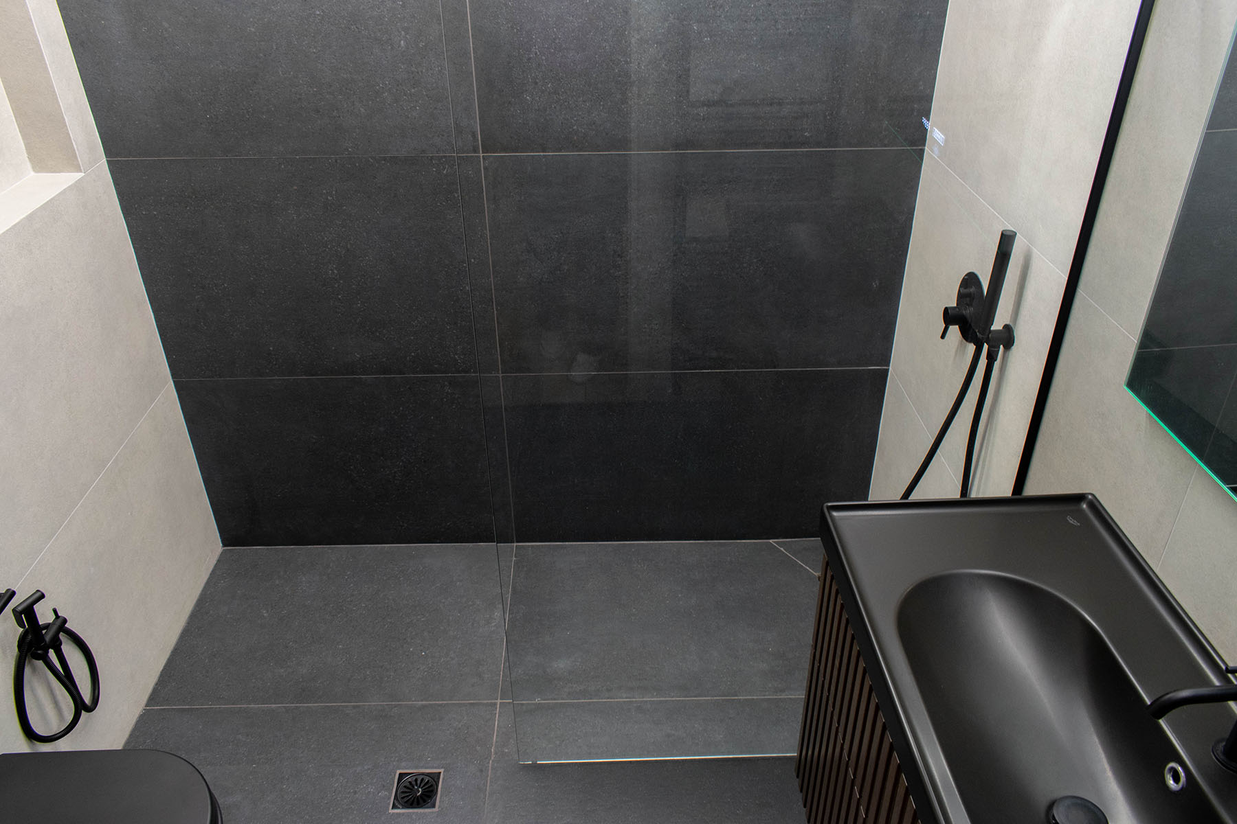 Το μπάνιο, από ένας απλός βοηθητικός χώρος, εξελίσσεται πλέον σε έναν προσωπικό χώρο χαλάρωσης και ευεξίας. Στη σύγχρονη αρχιτεκτονική και διακόσμηση εσωτερικών χώρων, η επιλογή των υλικών και των χρωμάτων παίζει καθοριστικό ρόλο. Ο συνδυασμός του μαύρου με το φυσικό ξύλο είναι ένας από τους πιο επιτυχημένους τρόπους να αποδώσουμε πολυτέλεια, στυλ και ζεστασιά σε ένα μπάνιο. Η ανακαίνιση μπάνιου έγινε από την εταιρεία Newhouse Deligiannis Giorgos.